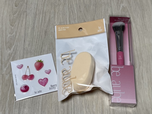 케이스 꾸미기용 스티커, 퍼프, 블러셔 브러쉬를 받았어요.